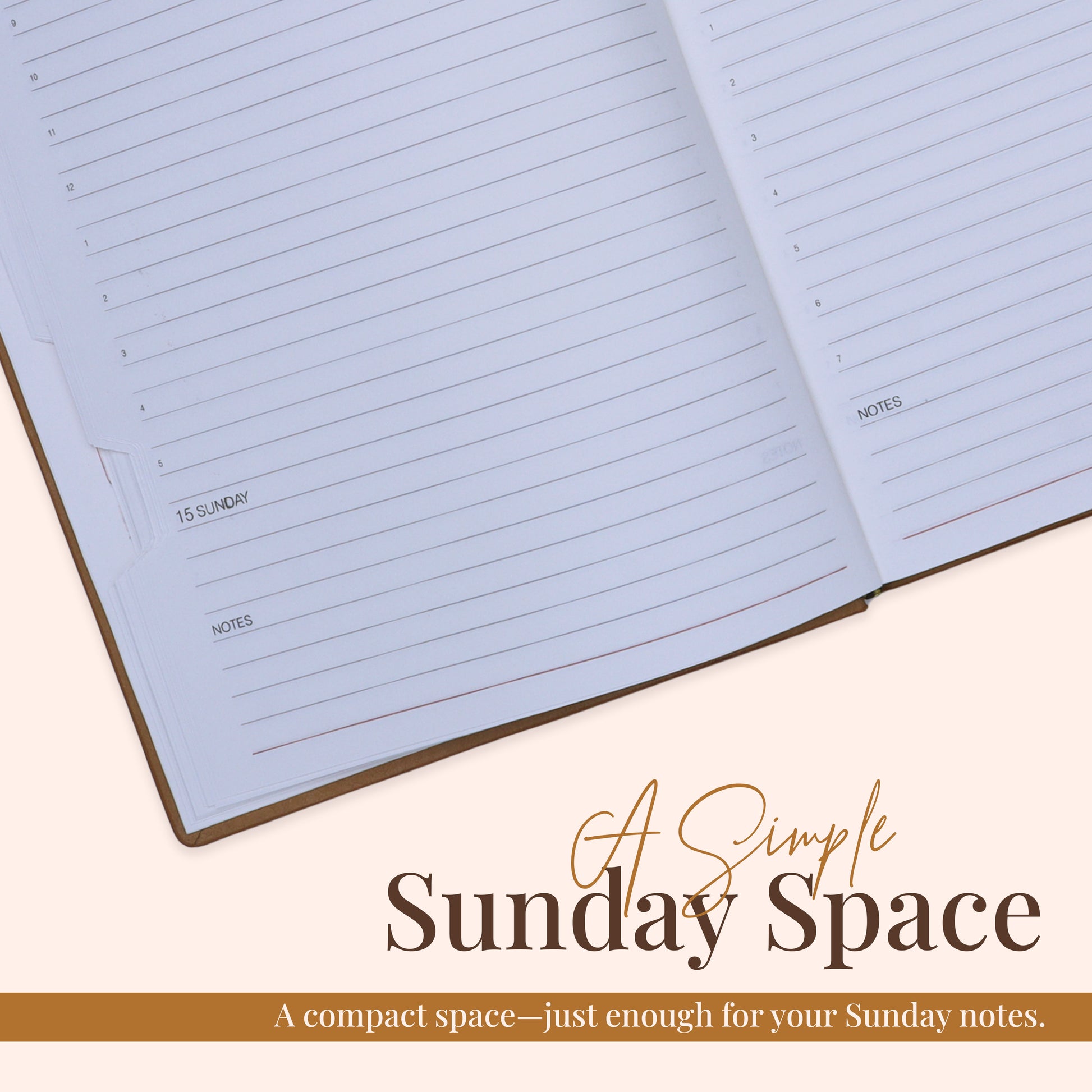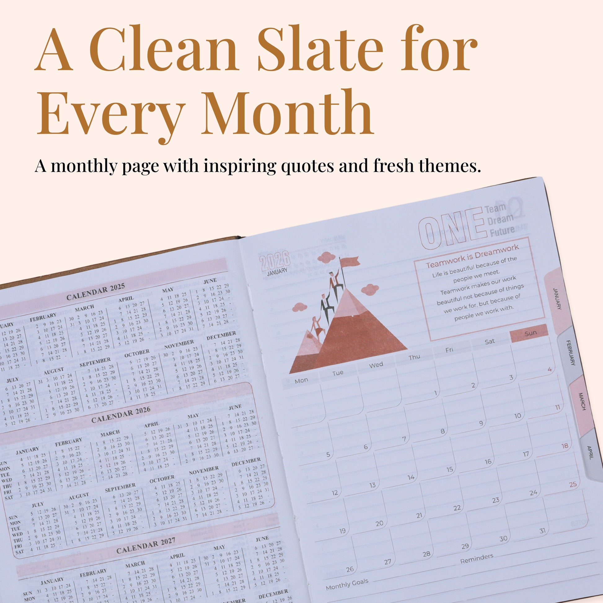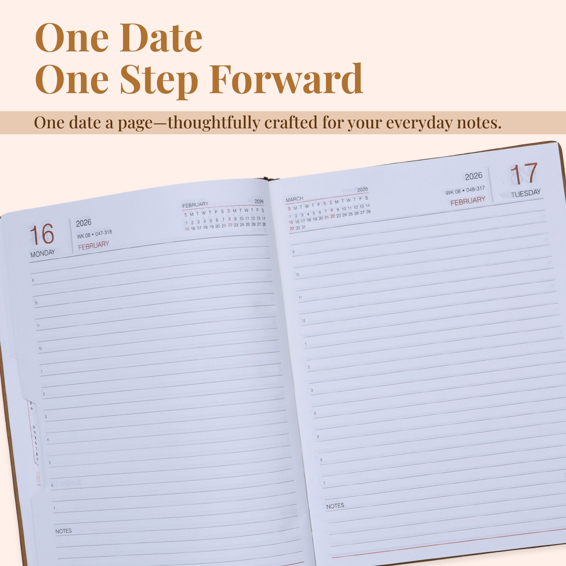 One-Date-a-Page layout with monthly tabbing helps organize tasks and goals efficiently.