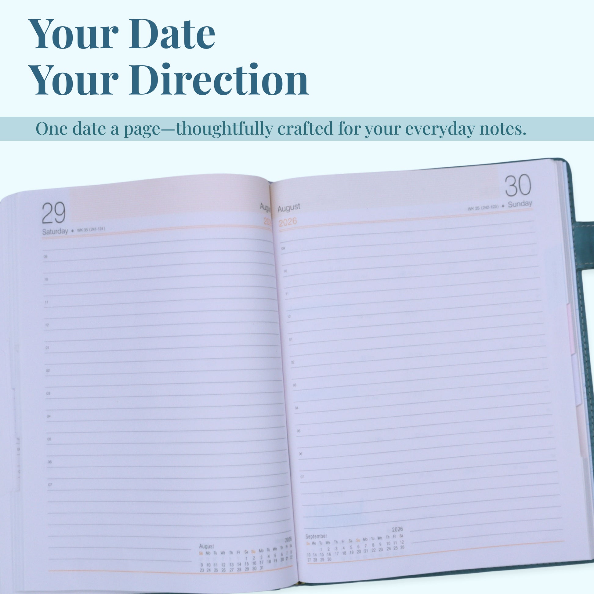 One-Date-a-Page format with planner and month tabs for complete scheduling control.