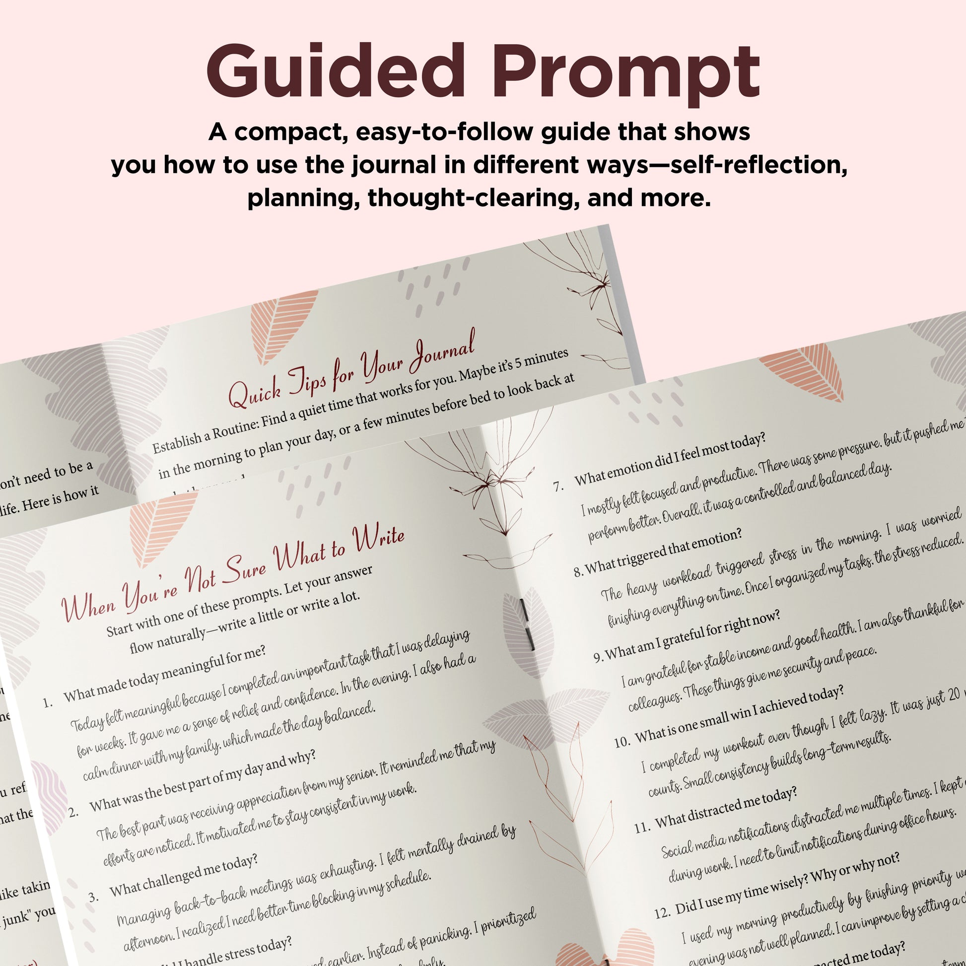Instead of being just a place to write, this journal helps users understand what to reflect on, how to put thoughts into words, and how to stay consistent without pressure. The guide offers direction, the trackers add gentle structure, and the journal pages give complete freedom to write honestly.